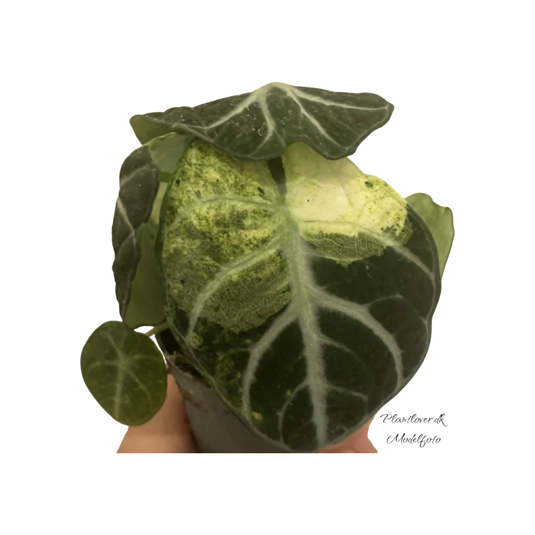 Den kombinerer det mørke, næsten sorte fløjlsagtige løv med uregelmæssige hvide og lysegrønne variegationer – og resultatet er en plante, der virkelig stjæler opmærksomheden i enhver samling.